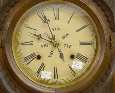 In a walnut case with a T&S movement; unmarked paper dials; a B.B. Lewis Calendar and the pendulum. The clock is running at this time. (There is no ke...