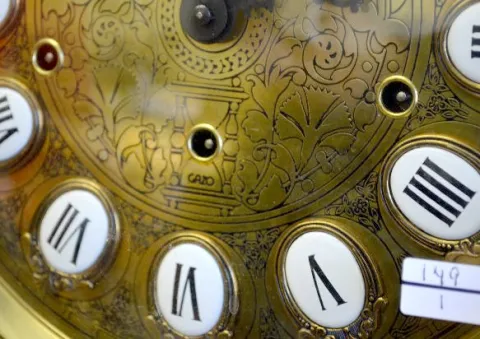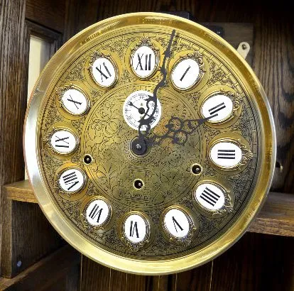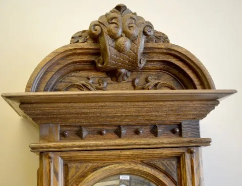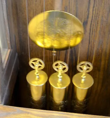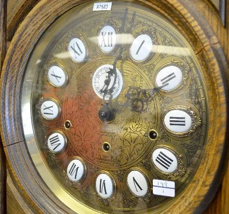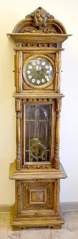 Etched porcelain and brass dial; with a bar strike musical movement. The alder case has a beveled glass door. An ornate pendulum and the 3 brass weigh...