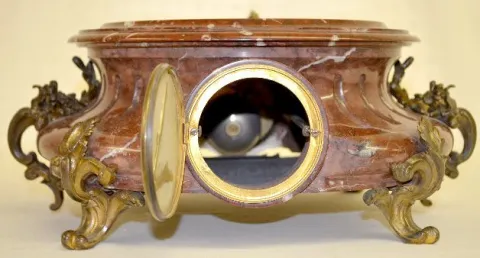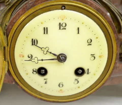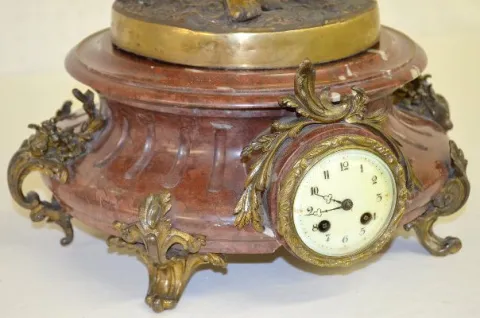 The strike is on a bell. There is a cream colored dial. Aug. Moreau designed the bronze figures of a boy and girl. They stand on a dark red marble bas...