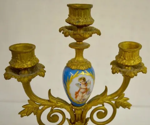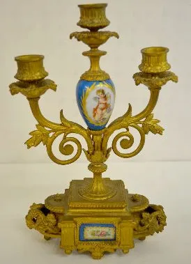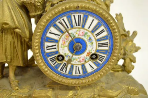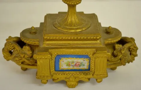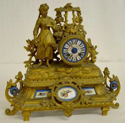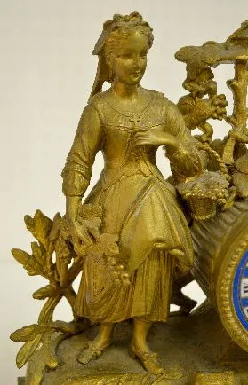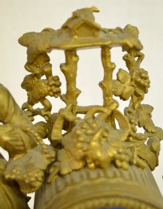 With bell strike movement, No. 418 and a porcelain dial. The white metal case with Sevres style porcelain inserts is topped with a woman, grapes and a...