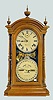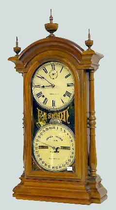 In a walnut case with an 8 day T&S movement; the upper dial, with 2nds bit, is marked "Patented"; the lower dial is marked "Southern Calendar Clock Co...