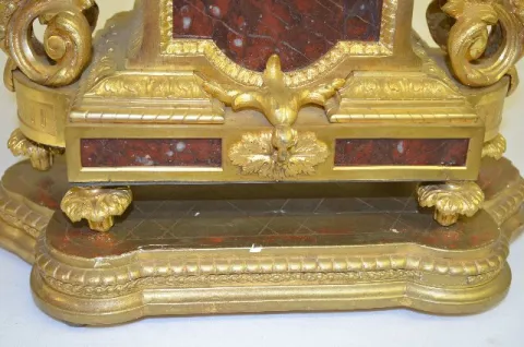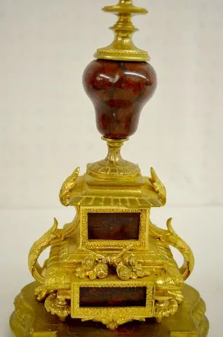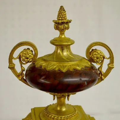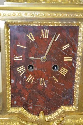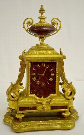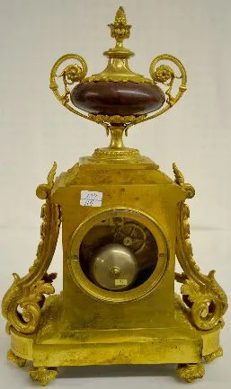 With 1/2 hour bell strike movement, No. 1637 and a brown marble dial. The gilt bronze case is topped with an urn and decorated with acanthus leaves. T...