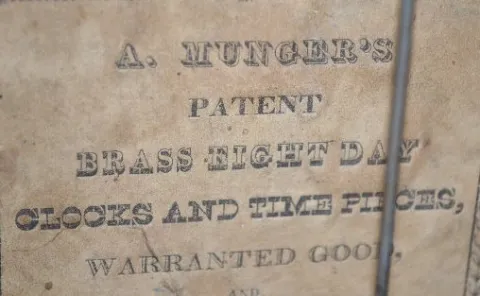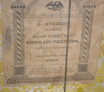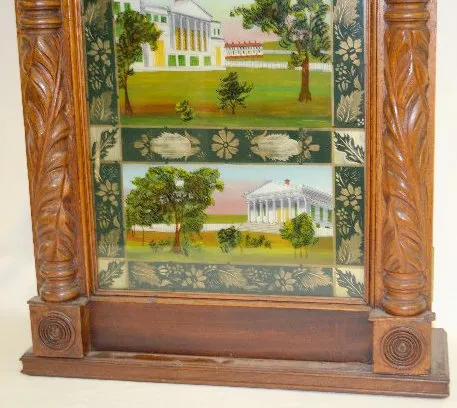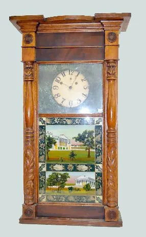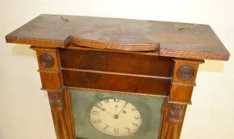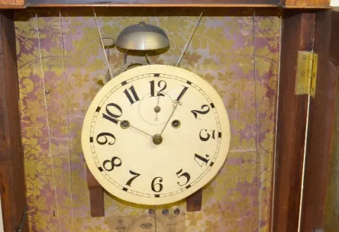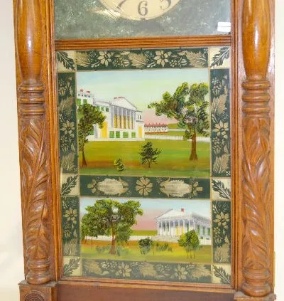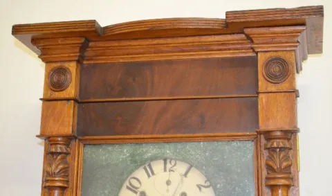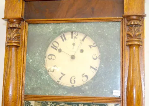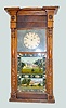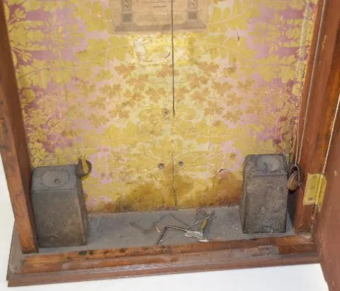 With an 8 day T&S movement; a painted steel dial with 2nds bit; an interior paper label; the weights and the key. The glass in the upper portion of th...