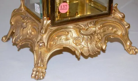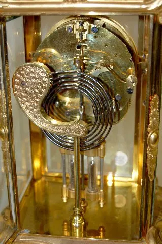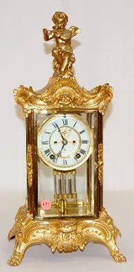 8 day T&S with 1/2 hour gong striking movement, a signed porcelain dial and open escapement. The 2 chamber pendulum has faux mercury slugs with a nice...