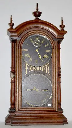 With an 8 day T&S movement and signed Seth Thomas black dials. "Fashion" is painted on the door. The door key is with the clock. In a case masterfully...