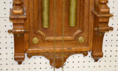 With an unmarked metal dial with visible movement; brass ornaments; 2 weights; and the pendulum. Not tested. 51 1/2" Long...