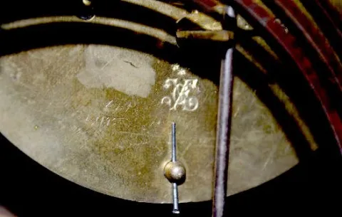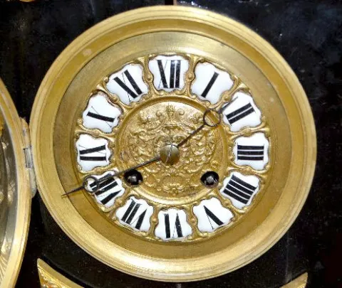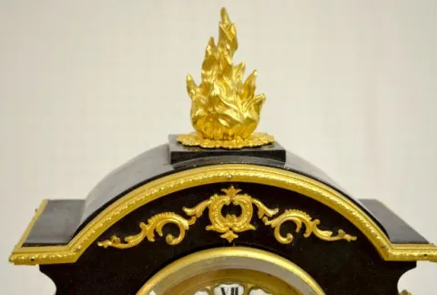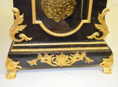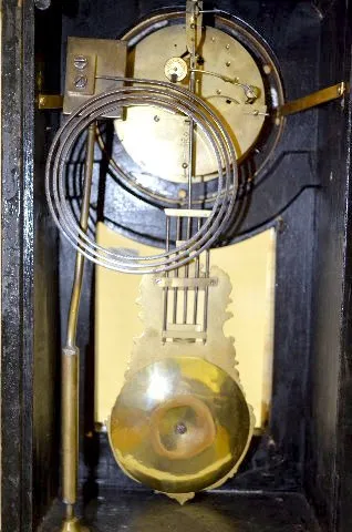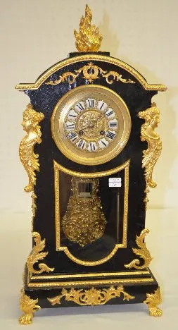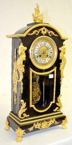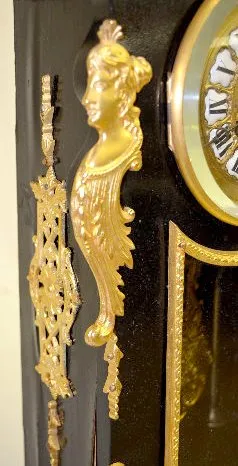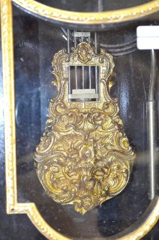 With a gong strike movement, a fancy pendulum and a dial with porcelain Roman Numerals. In an ebonized wood case with gilt bronze decorations, includi...