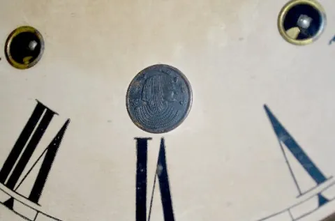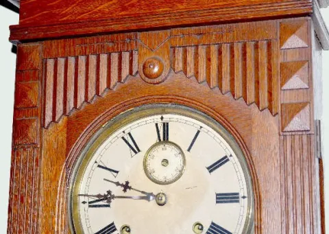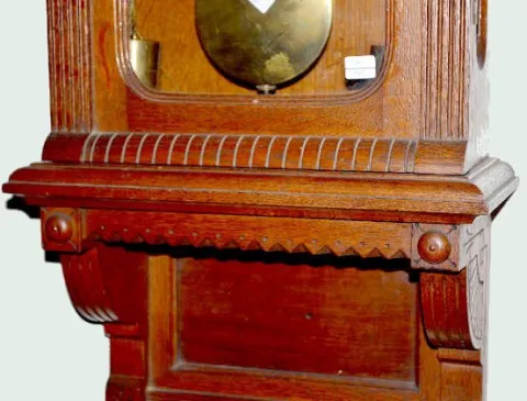 With an 8 day T&S, weight driven movement; a paper dial with an Egyptian head medallion and 2nds bit; the pendulum and 2 weights. Not tested. Clock - ...