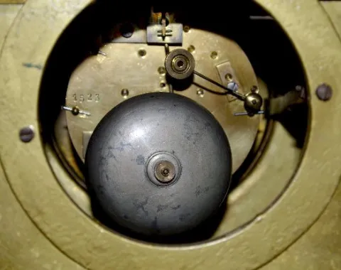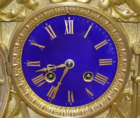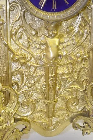 With 1/2 hour bell strike movement, No. 1523 and a blue porcelain dial. The brass case has free moving handles and an angel like figure below the dial...