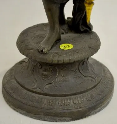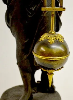 With a TO, signed "Ansonia" movement and a metal statue. The clock is running at this time. (The original patina to the ball is tarnished. There is no...