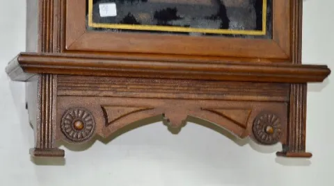 In an ornate case with a signed dial and brass pendulum. Not tested. (There are minor paint flakes.) 40" Long...