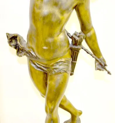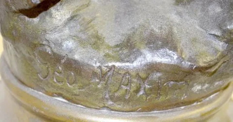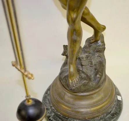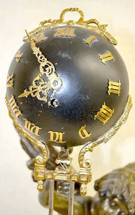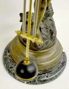 With a TO movement, this large double black ball clock has a metal statue on a green marble base; is signed Geo. Maxim and has the France foundry mark...