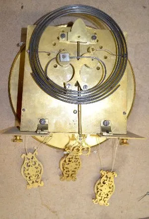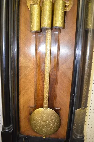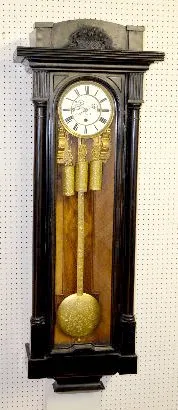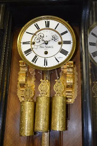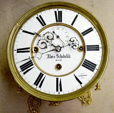 With 3 winding arbors; a porcelain dial signed "Alois Schebelik WIEN"; and heavily engraved gilt weights, bracket, pendulum and pendulum stick. In an ...