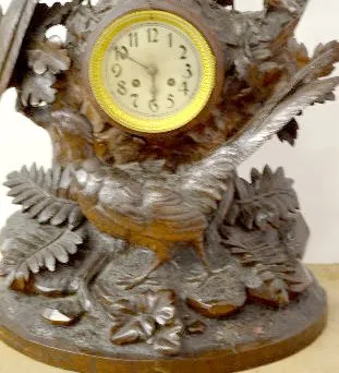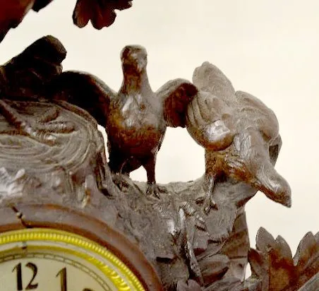 In a walnut case with an 8 day T&S French movement numbered 12538 and an unmarked silvered metal dial. The carved case has 2 large pheasants and 2 bab...
