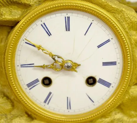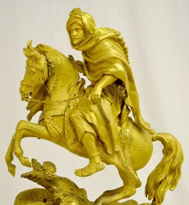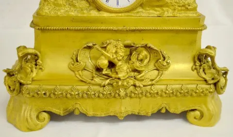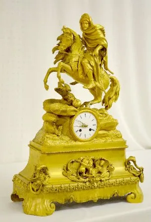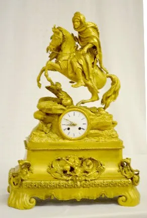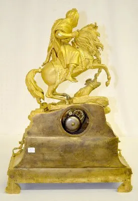 With a bell strike movement and a porcelain dial. The gilt bronze case has an Arabian theme - there is a rearing horse with an armed Arabian rider abo...