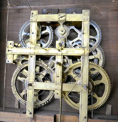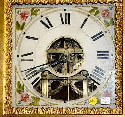 circa 1960's to 70'; painted wood dial with cutout for a visible movement by Martha Smallwood with a weight driven, 8 day strap movement marked B.M. &...