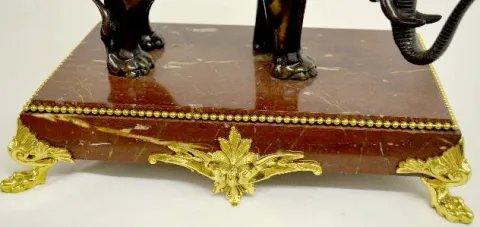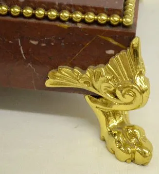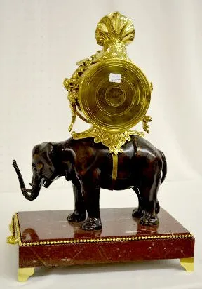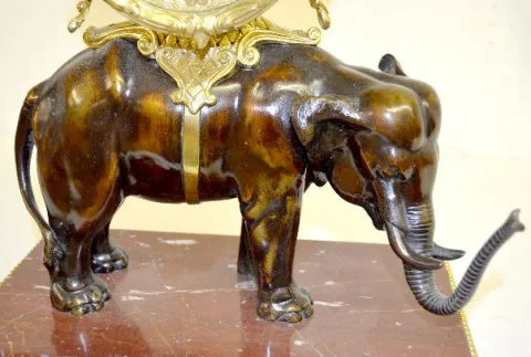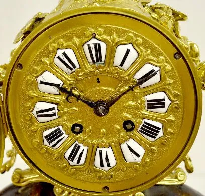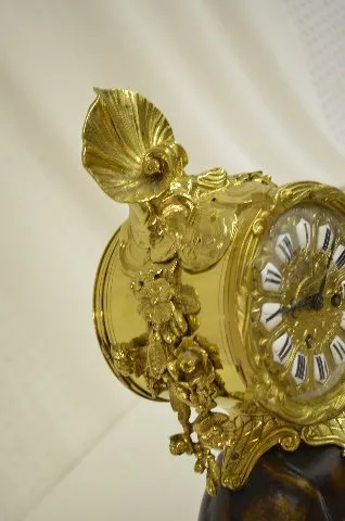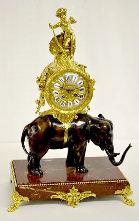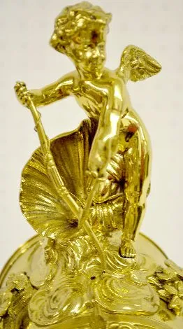 The bell striking movement is No. 1625 and has porcelain numerals on the metal dial. The highly polished features include a cherub with bow and arrow ...