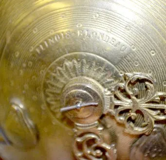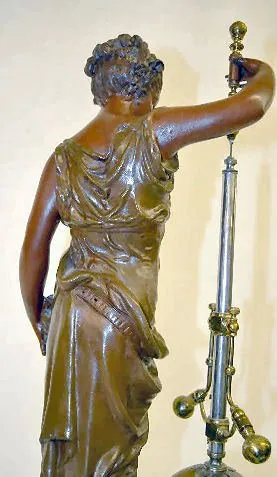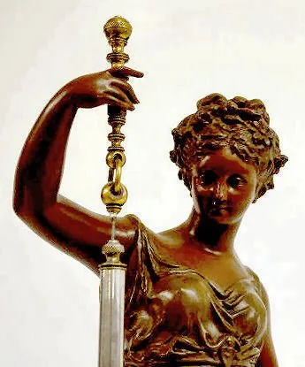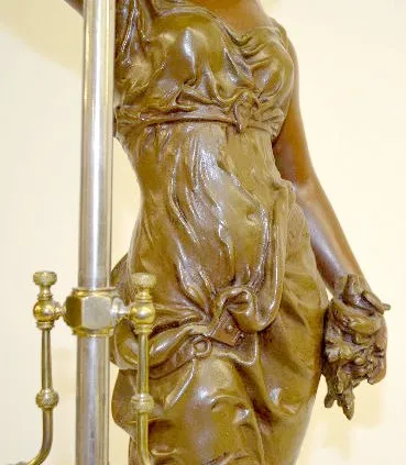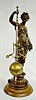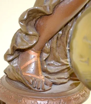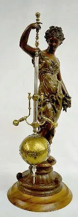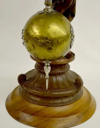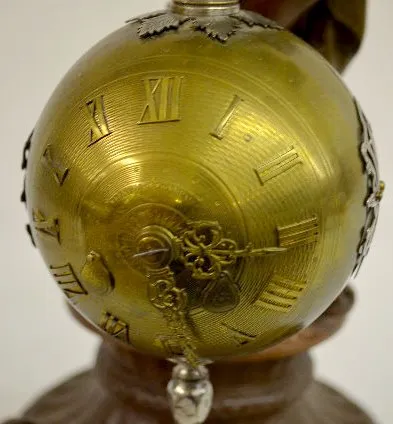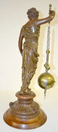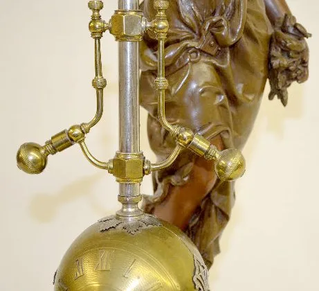 With an 8 day Time and Bell Strike movement. The pendulum is marked "Flinois Blondeau Horloge". The metal statue, with bronze balls, is mounted on a w...
