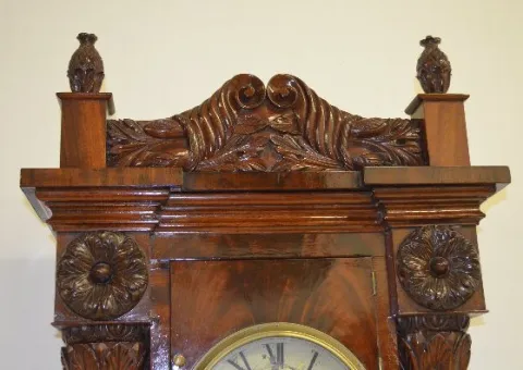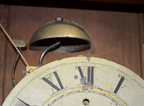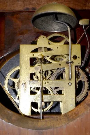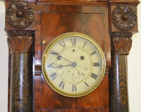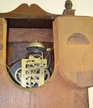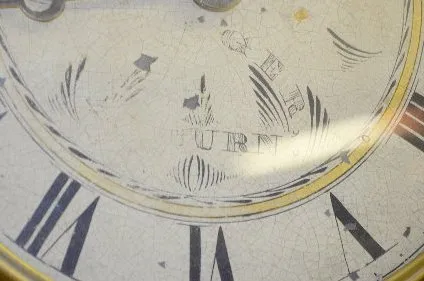 With an 8 day T&S movement; a painted steel dial with 2nds bit and the letters "GER' and "URN" (should read "Munger, Auburn"); a bell above the dial; ...
