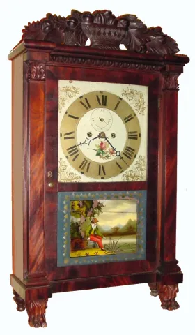 Refinished mahogany veneered case in very good condition. Original reserve painted tablet of a boy fishing at the lake, has a single horizontal crack....