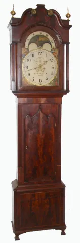 Mahogany veneered and inlayed Gothic style case in old finish with some cracking of the veneer on the base from the basic construction techniques tele...