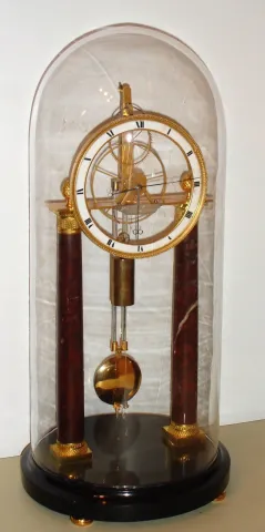 Austrian, Mathias Wibral [in Wien], a weight driven, pull wind, 2-wheel Empire era skeleton clock, with mercurial compensating pendulum, first qtr of 19th Century, with glass dome, one day duration.