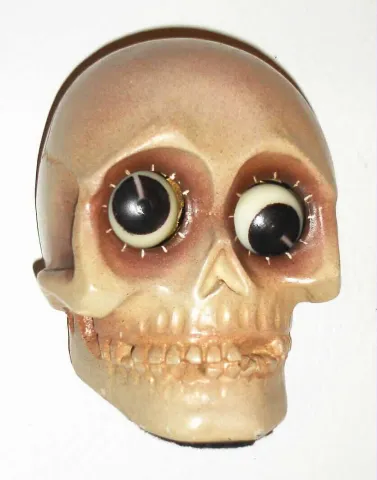 Oswald Uhrenfabrik, Germany, "Skull" rotating eye time piece, 30 hour, time only, spring driven movement in a composition case with grey skull and brown eyes, c1930