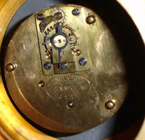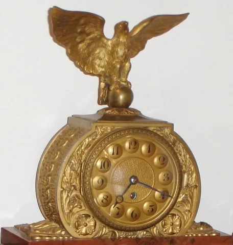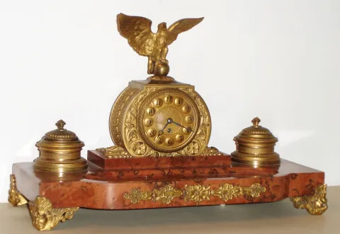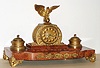 French, for "Wiener Uhrenindustrie, GMBH" marble and bronze, clock, pen and ink desk set, surmounted by a spread wing eagle, c1900.