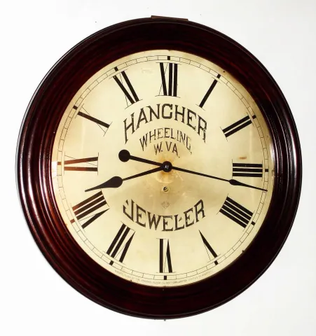 There is a nice soft gloss finish on this large wall clock. The original paper dial tells us the clock was made for a West Virginia jeweler, and has ...