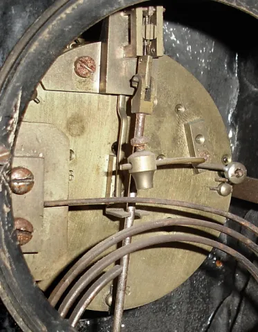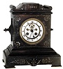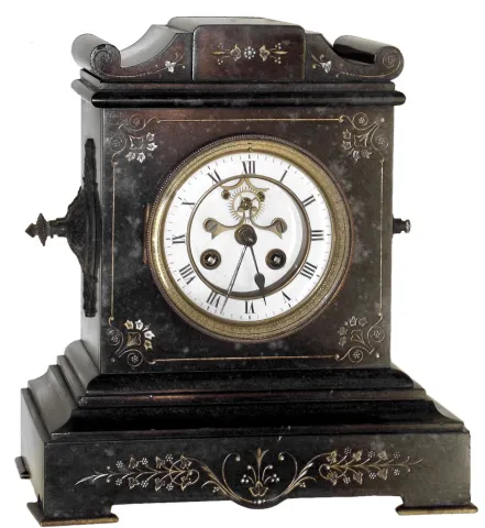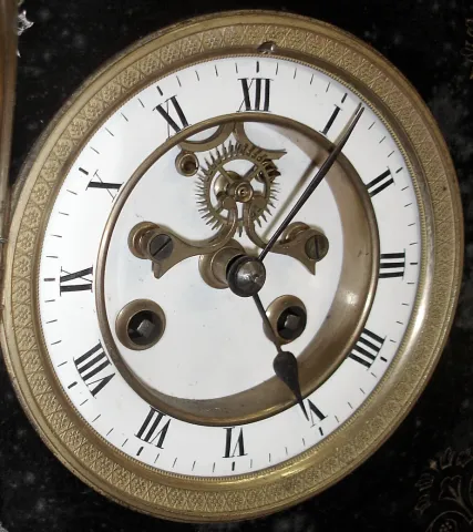 French, black slate 8 day, time and strike mantel clock, visible escapement, c1900