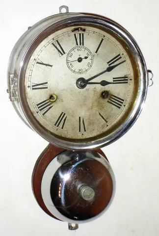Seth Thomas Clock Co., Thomaston, Conn., "Ship's Bells", 30 hour, time and strike, nickel marine clock, c1884