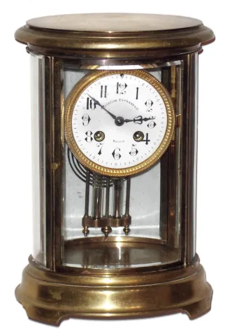 French brass and glass oval 8 day, time and strike crystal regulator mantel clock, c1890
