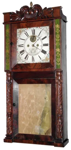 Refinished mahogany veneered case with some minor veneer repair and veneer chips on the door. Original painted wood dial is very nice for its age. Mir...