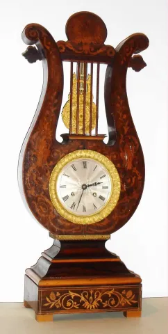 French, lyre form marquetry inlayed , 8 day, time and strike, mantel clock, c1880.