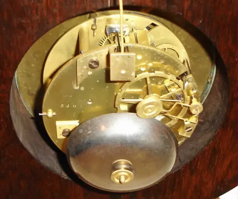 Rosewood veneered and inlayed case in nice as found condition in original finish. The contrast of the inlay to the rosewood veneer is obscured by the ...