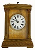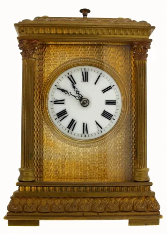 French carriage clock with petite sonnerie striking on gongs, spring powered eight day time only movement with silvered lever platform, in an ornamented Anglaise style brass case, with beveled glasses, case with Corinthian columns and foliate border top a