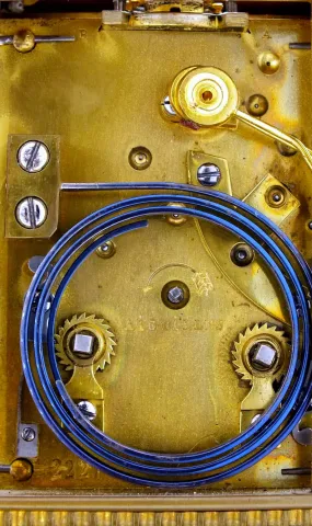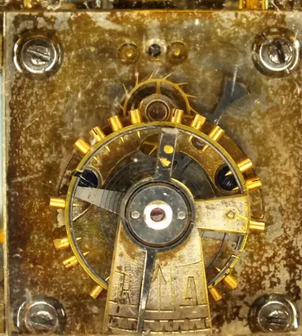 Brass case complete, with dull surface, glasses without damage, original movement running, striking only the hour and half hour in passing, missing t...
