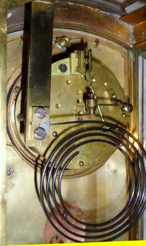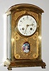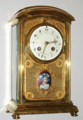 French crystal regulator in fancy polished brass case, spring powered time and strike movement, heavy beveled glasses on sides, back and top, the front with latticework panels backed with brass, decorated in a moire pattern, with an enamel portrait of a l