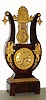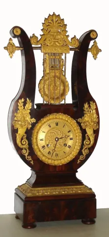 French lyre form mantel clock, spring powered eight day time and strike movement, visible gilt brass gridiron pendulum with acanthus and swan decoration suspended above the movement, Roman numeral dial with painted figures, the case veneered in good quali