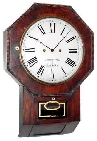 Atkins, Whiting and Co., Bristol, Conn., "Octagon Drop XX Regulator" with type III (fancy frame) wagon spring, 30 day, time only movement in a rosewood veneered case with ripple molding around the top, c1855