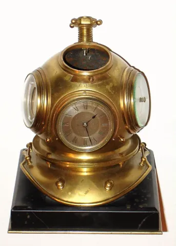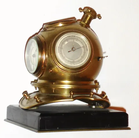 French, "Diver's Helmet", time piece with Barometer, Thermometer, and compass (missing). This clock is from the Industrial series, c1885