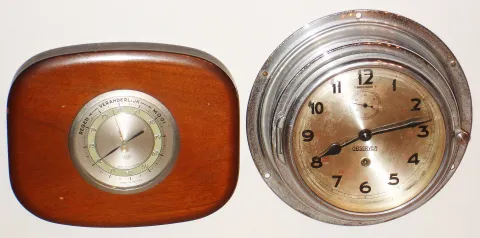 Observer, 8 day, time only, marine clock in nickel plate case, accompanied by Elkro French mahogany barometer, 20th century