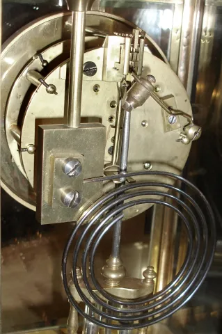 there is an old dull patina on the lacquered brass, and the beveled glasses all are good. The porcelain dial is fine with slight wear to the seller n...