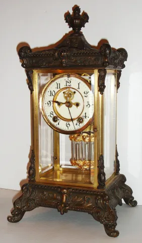 Ansonia Clock Co., Brooklyn, N.Y., "Elysian" model crystal regulator, ornate cast top and bottom with gilt finish, beveled glasses, white enamel Arabic numeral dial, 8 day, time and strike, movement with round plates, Brocot open escapement, gilt simulate