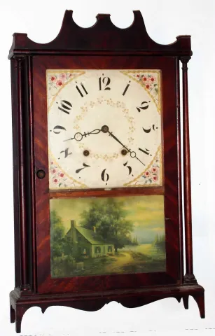 E. Terry and Sons, Plymouth, Conn., 30 hour time and strike wood movement pillar and scroll shelf clock. Very late example by this firm with late P&S dial (minute markers outside chapter). c1832