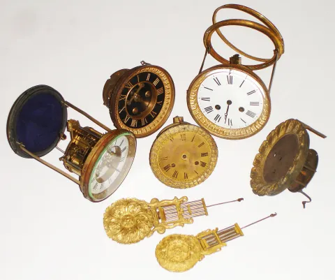 French clock movements- 5 (Five) with dials, 2 with rear case rings, plus 2 fancy gridiron pendulums, late 19th century
