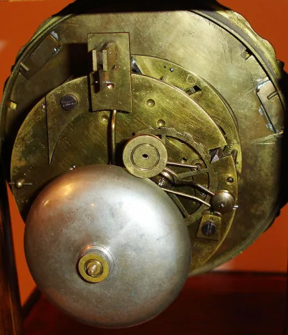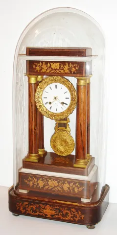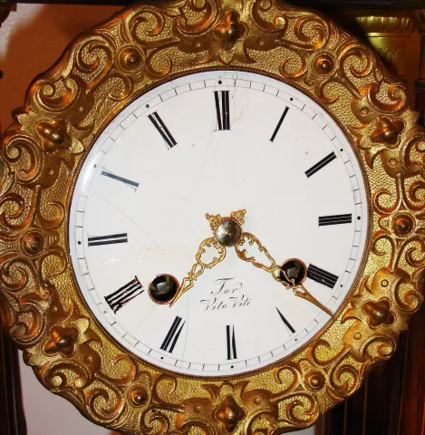 Movement very dirty, both trains functional, will need cleaning, dial with hairlines and repaired losses, pendulum dirty, but with good gilding, bezel...