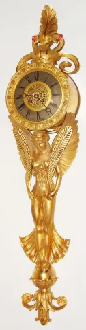French wall clock in a very unusual and appealing style, 8 day, time and strike, pendule a Paris movement, recoil escapement and rack striking on a bell, silvered Roman numeral dial with pierced gilt center with bellflower and anthemion ornament, the gilt