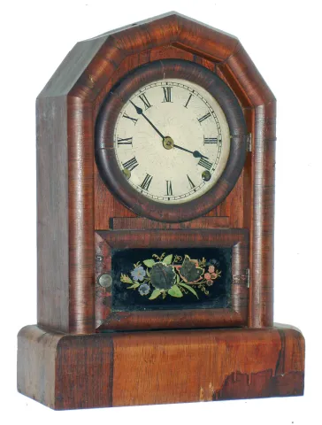Rosewood veneered case in an old finish with veneer loss on the base. Original painted dial. Original tablet with loss to the flowers. Poor label i...