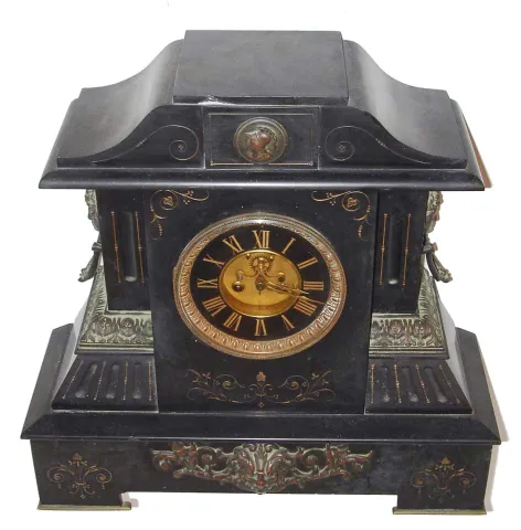 French mantel clock, 8 days, time and strike, spring driven movement with open escapement in a large black marble case with applied bronze castings, c1880